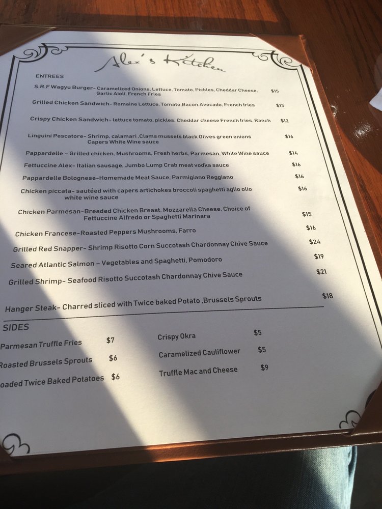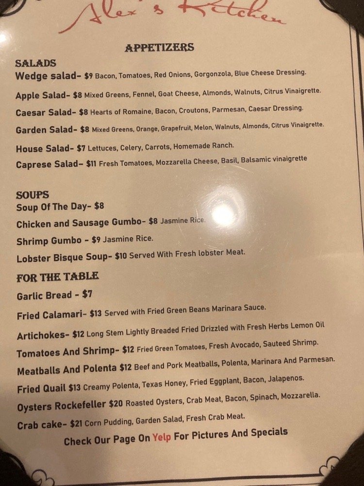 Located in Missouri City, TX, Alex's Kitchen offers a unique blend of New American and Italian cuisine. This intimate and upscale restaurant provides a variety of dining options, from vegan dishes to hearty steaks. Customers rave about the flavorful shrimp scampi, eggplant Parmesan, and perfectly cooked steaks. The attentive waitstaff, cozy ambiance, and delicious food make Alex's Kitchen a hidden gem worth visiting. With options for takeout, catering, and private dining, this restaurant caters to every occasion. Whether you're looking for a romantic dinner or a casual meal with friends, Alex's Kitchen has something for everyone. Don't forget to ask about their specials for a truly unforgettable dining experience.